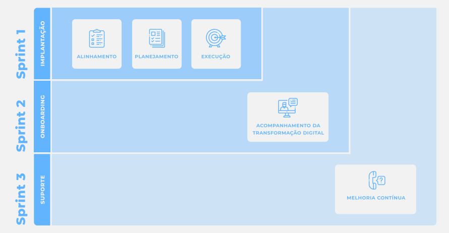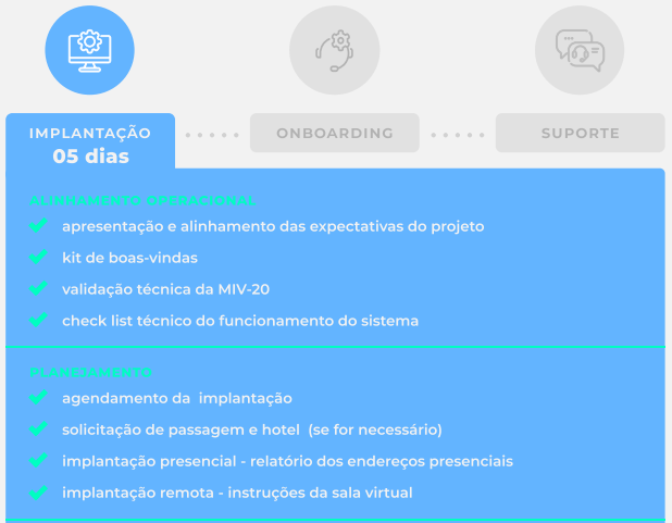 A MIV-20 é composta por 3 etapas: Implantação, Onboarding e Suporte. O método é focado na educação da cultura de processos e na transformação digital do negócio.